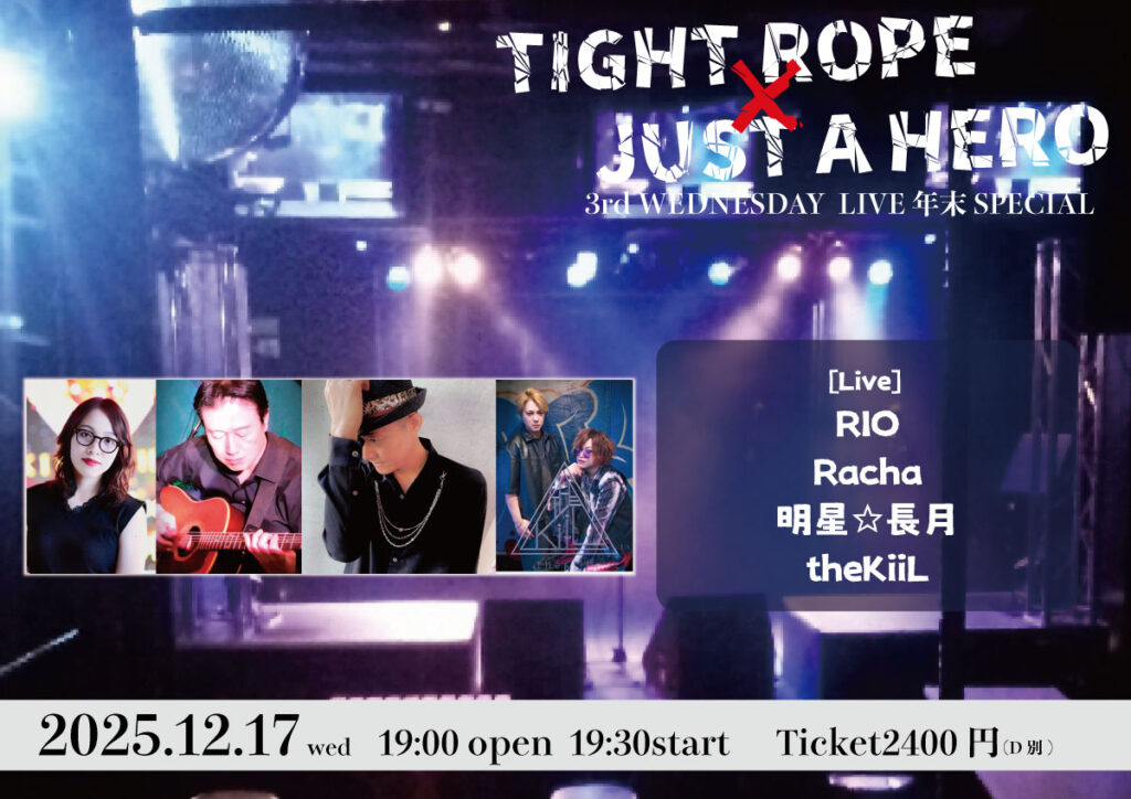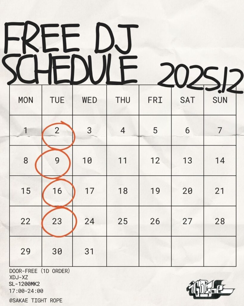 名古屋栄TIGHT ROPE 2025年12月のイベントスケジュールです。TIGHT ROPEではライブイベントをはじめDJイベントなど様々なイベントを開催しております!各公演のチケット予約・公演に関するお問い合わせはこちらからお願いいたします。またスケジュールの空き日には貸切パーティー利用、スタジオ利用も受け付けておりますのでお気軽にお問い合わせください