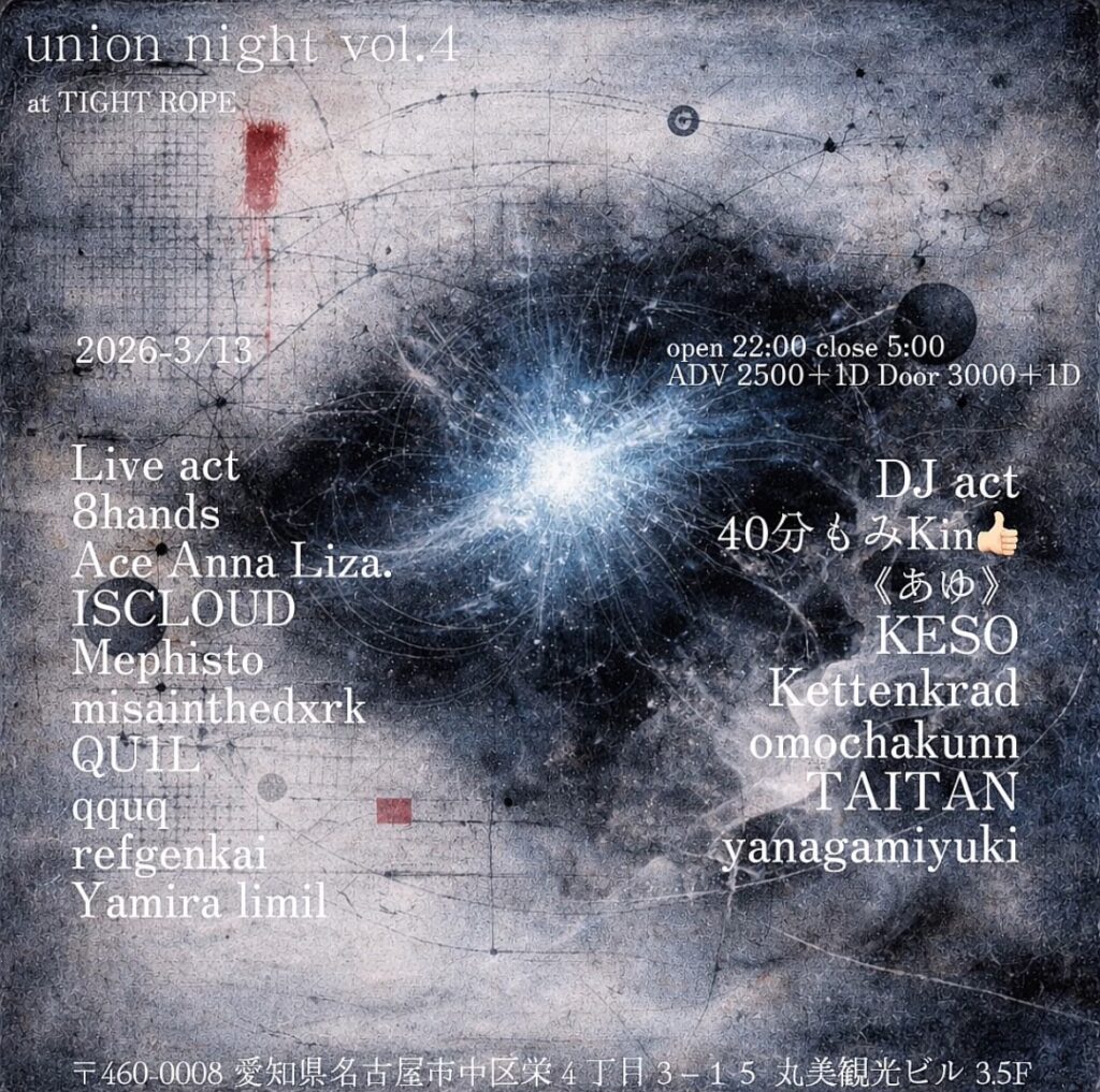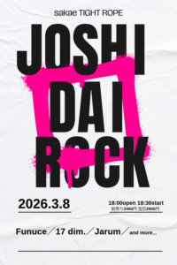 名古屋栄TIGHT ROPE 2026年3月のイベントスケジュールです。TIGHT ROPEではライブイベントをはじめDJイベントなど様々なイベントを開催しております!各公演のチケット予約・公演に関するお問い合わせはこちらからお願いいたします。またスケジュールの空き日には貸切パーティー利用、スタジオ利用も受け付けておりますのでお気軽にお問い合わせください